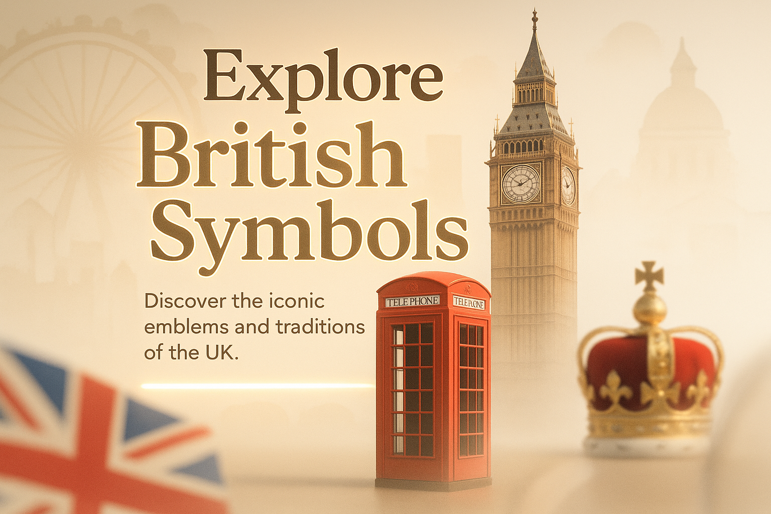 Elegant graphic showcasing British symbols like Big Ben, a red telephone box, and a crown. Ideal for educational content or tourism promotion.
