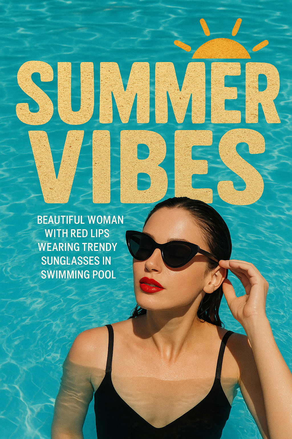 Vibrant summer-themed image featuring a woman in sunglasses enjoying a swimming pool, ideal for lifestyle and fashion marketing.