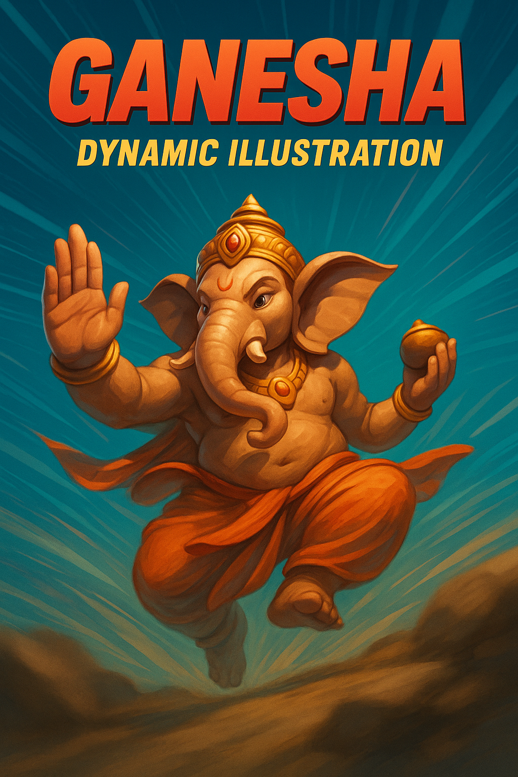 This image features a dynamic illustration of Ganesha, showcasing vibrant colors and an energetic pose. Suitable for cultural or spiritual themes.