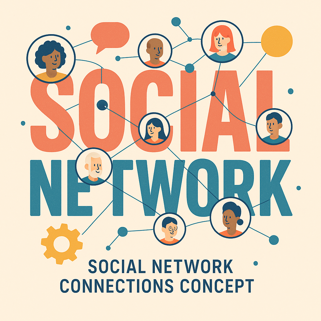 Colorful illustration depicting social network connections with diverse characters, ideal for digital marketing or technology-themed projects.