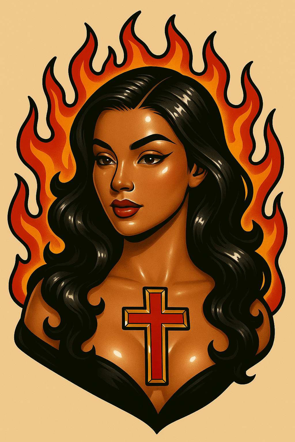 A striking tattoo design showcasing a woman with a cross on her chest, surrounded by vibrant flames. The artwork is glossy, with an anime-inspired style and artistic crop against a light beige background.