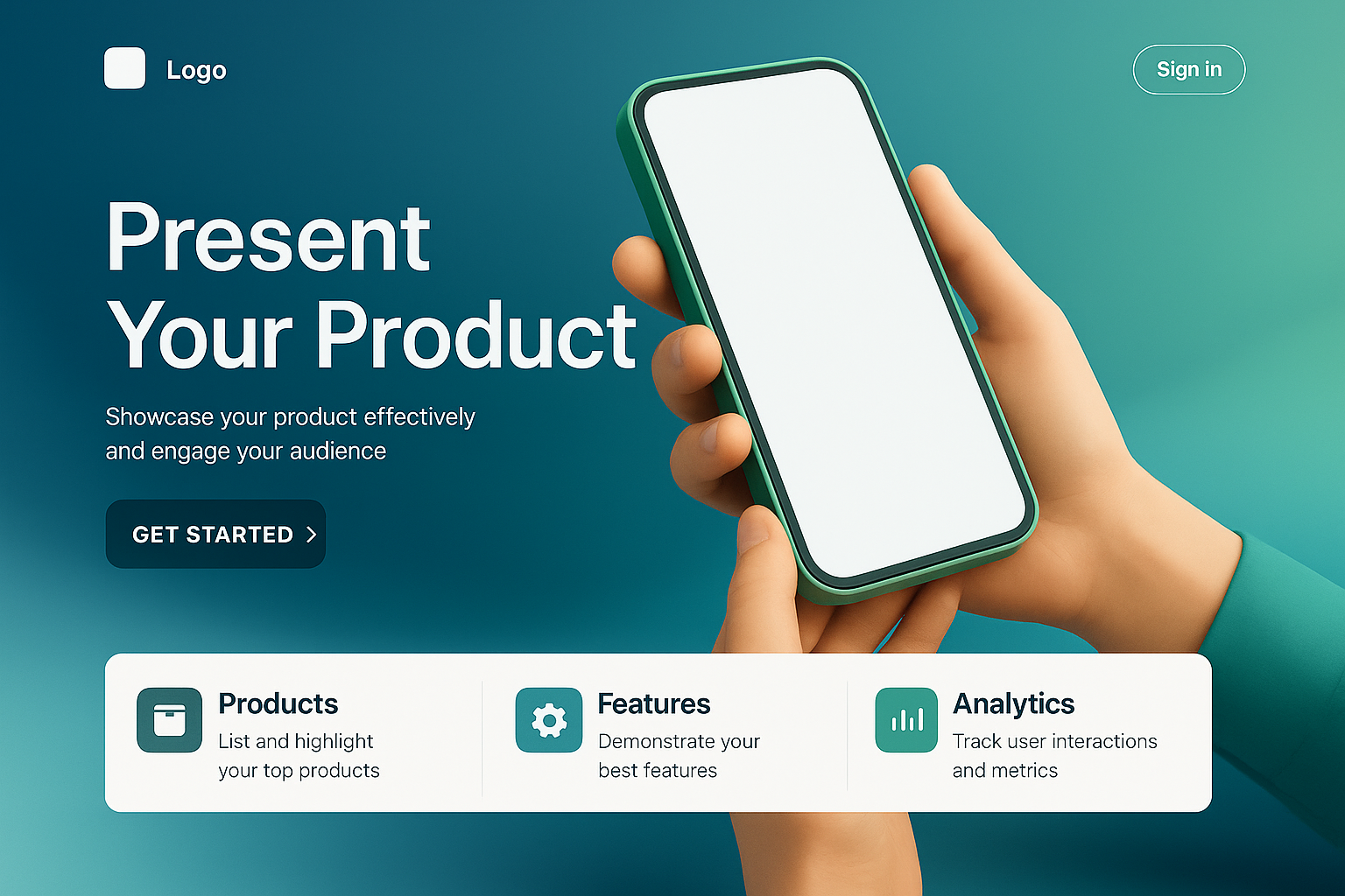 /Collection: /by davooda/Type: PNG/A modern landing page design featuring a green smartphone held in hands, showcasing a white screen. The layout includes sections for products, features, and analytics.