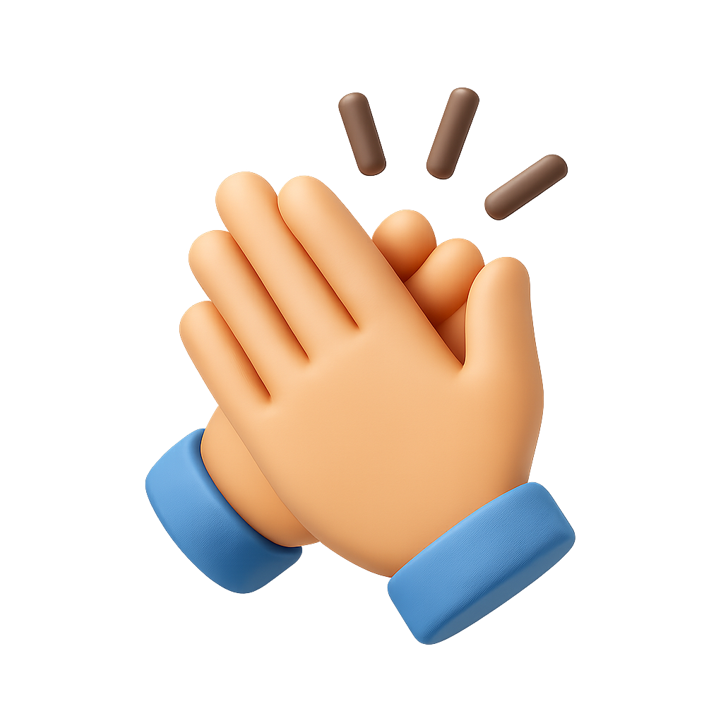 A vibrant 3D icon of two hands clapping, depicted in a three-quarter view with a smooth, volumetric design. The hands are highlighted against a subtle gradient background.