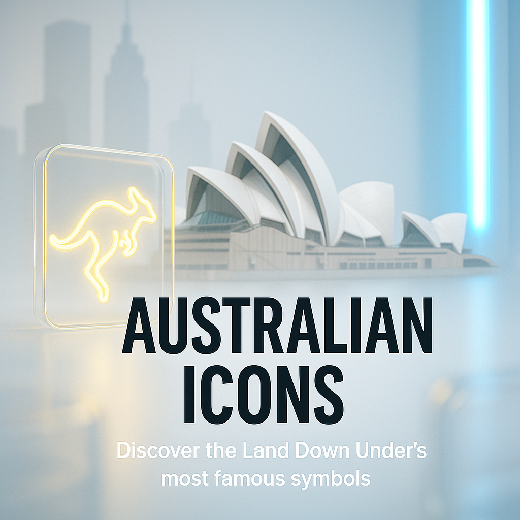 A modern digital graphic showcasing iconic Australian symbols like the Sydney Opera House and a kangaroo, designed for travel or cultural content.