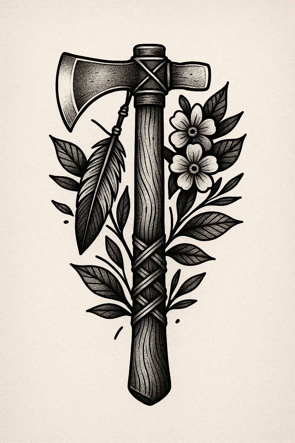 This image features a detailed illustration of an axe surrounded by flowers and leaves, showcasing a blend of nature and craftsmanship. Ideal for tattoo art or graphic design.