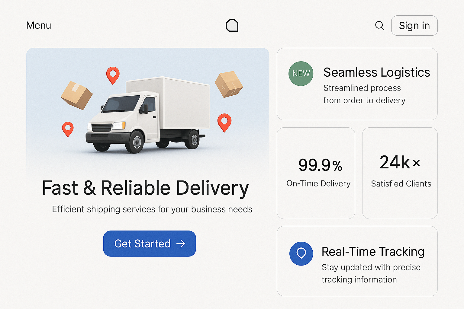 A sleek landing page showcasing a delivery truck with parcel boxes. Key features include on-time delivery stats and real-time tracking, all in a minimalist layout.