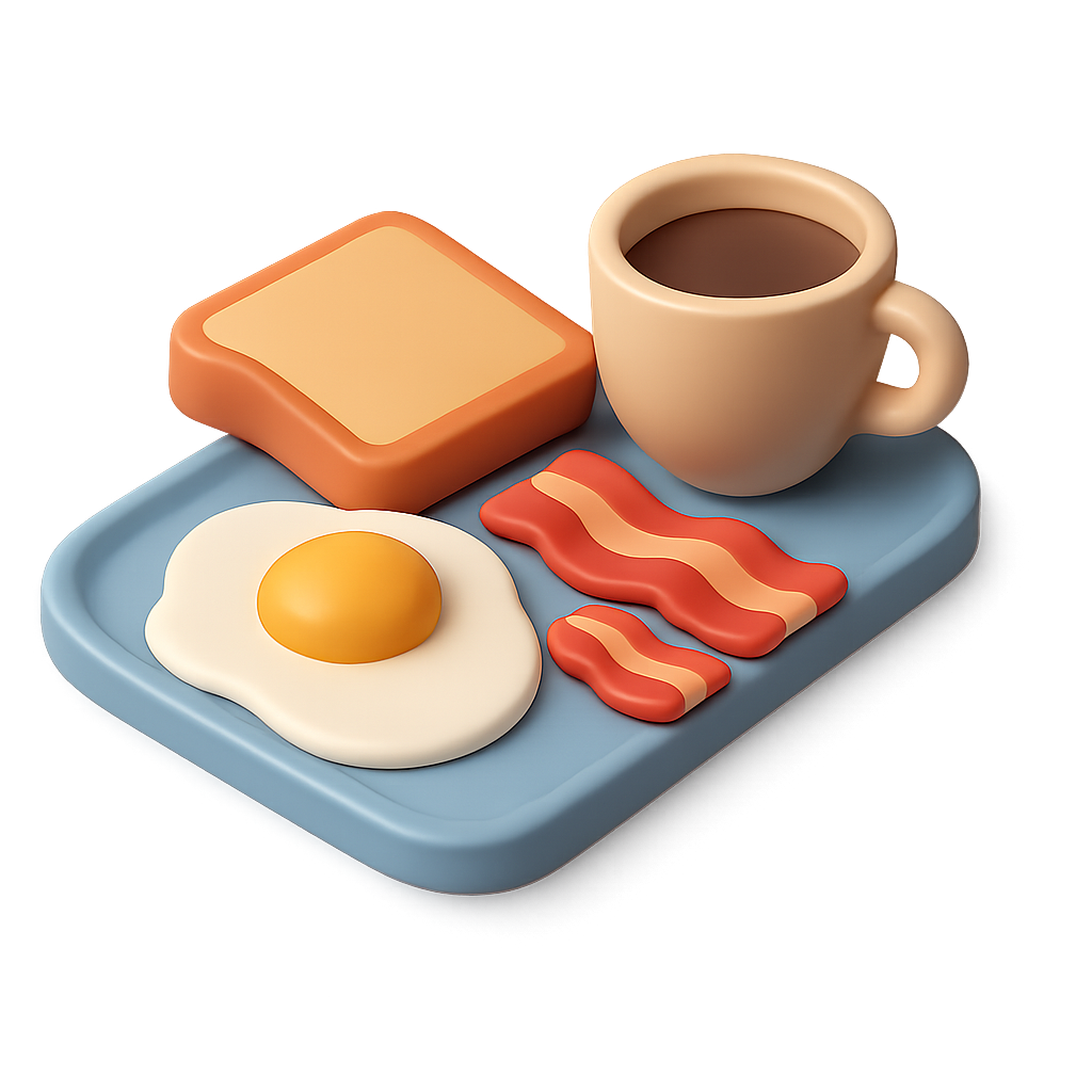 A visually appealing 3D breakfast icon featuring an egg, bacon strips, toast, and a coffee cup, all presented on a tray with a soft color palette.