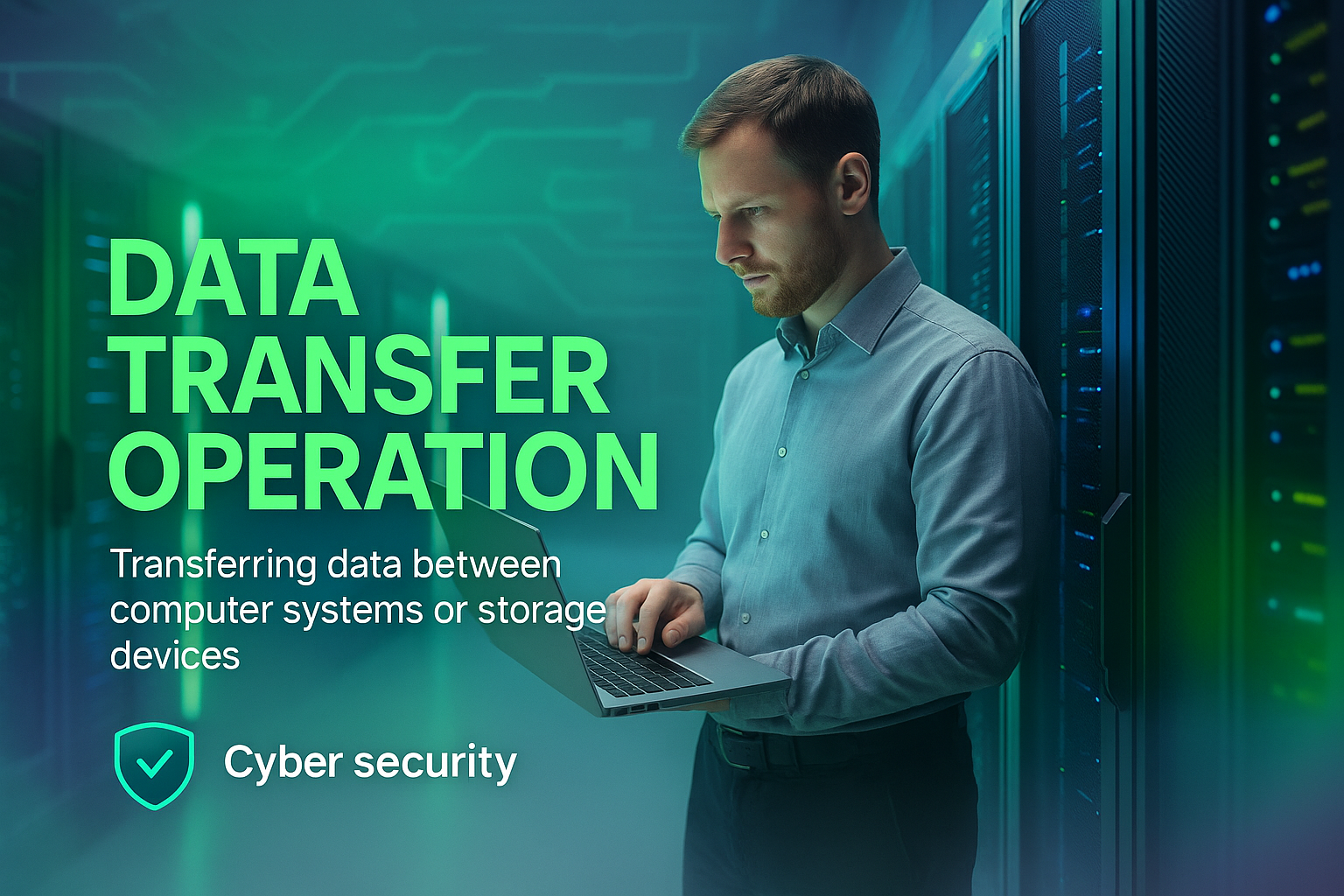 A modern graphic depicting a professional engaged in data transfer operations, emphasizing cyber security themes. Ideal for tech-related presentations or marketing.