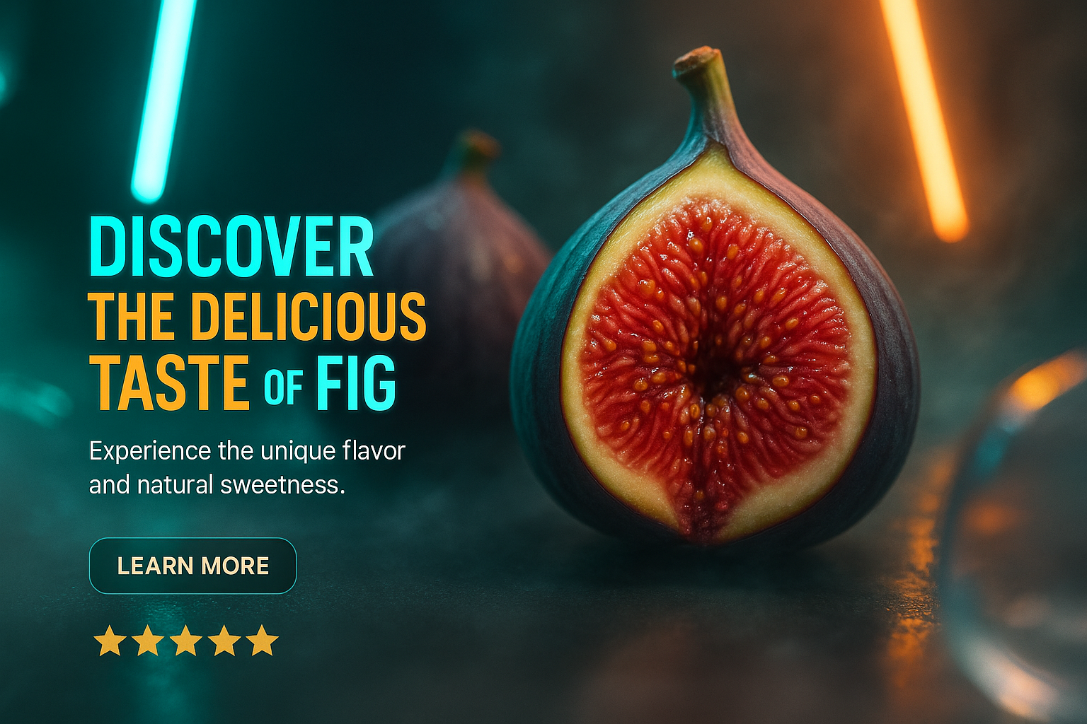 A dynamic, layered carousel slide featuring a fig, illuminated by neon accents. The design emphasizes the fruit's texture and sweetness with engaging text and glowing elements.