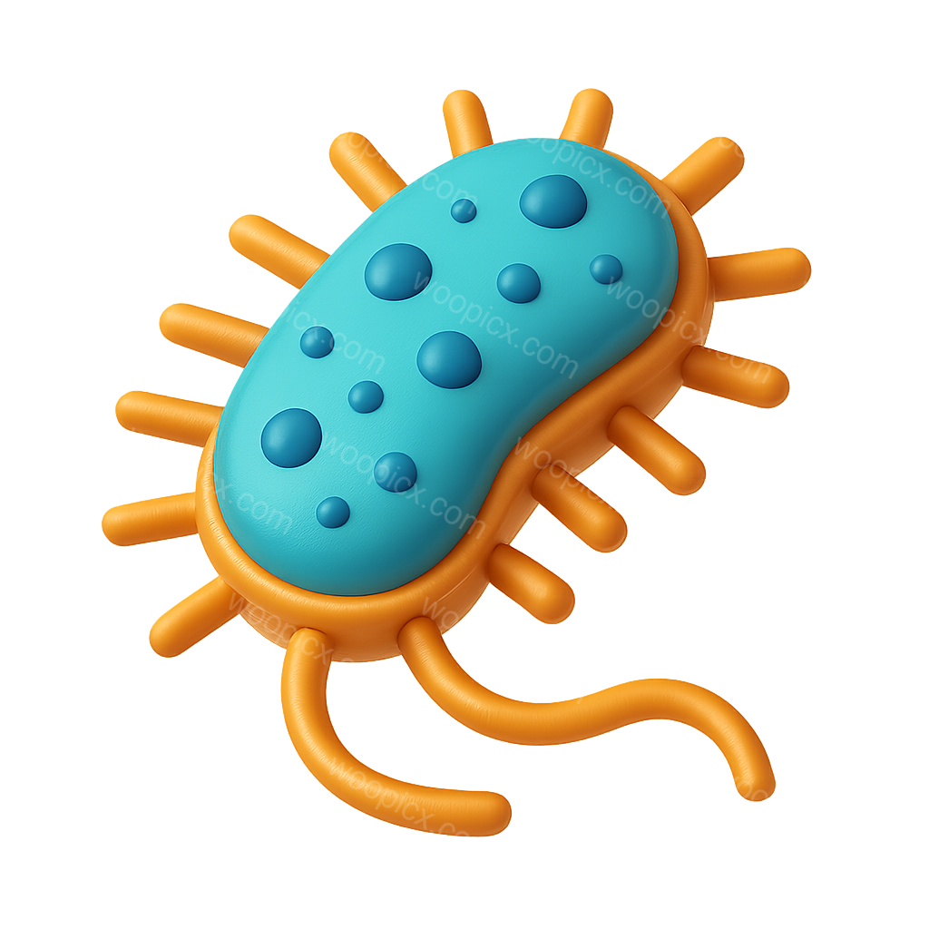 A vibrant 3D representation of a bacteria icon featuring a blue and orange color scheme. The design includes protruding structures and a glossy finish, set against a gradient background.