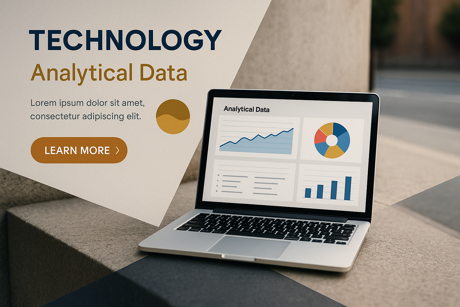 /Collection: /by davooda/Type: PNG/A laptop sits on a stone surface, showcasing analytical data visualizations. The design includes contrasting colors, a clear hierarchy, and a professional aesthetic.