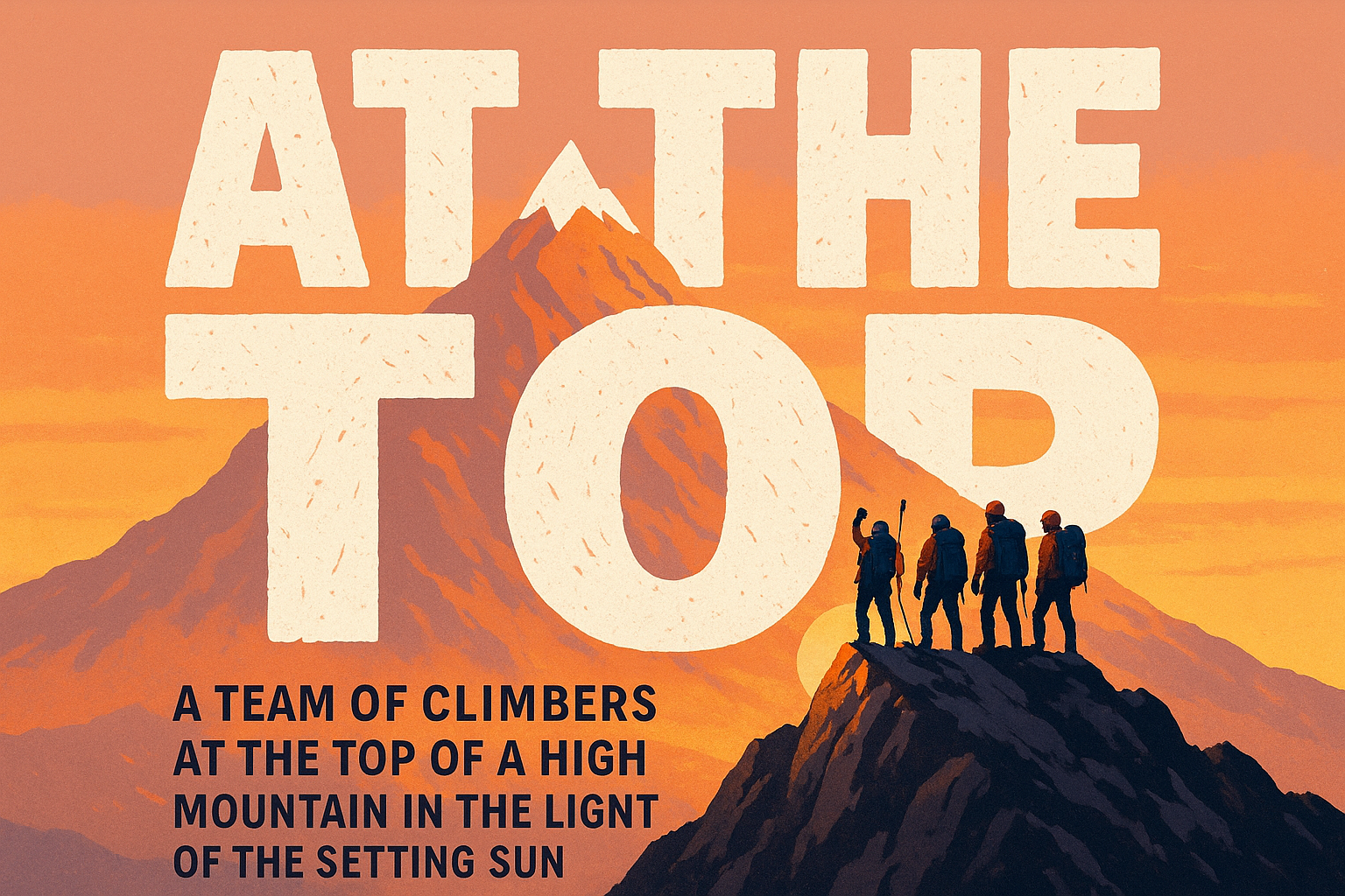 Dramatic graphic depicting a team of climbers silhouetted against a vibrant sunset backdrop, perfect for motivational content or adventure-themed marketing.