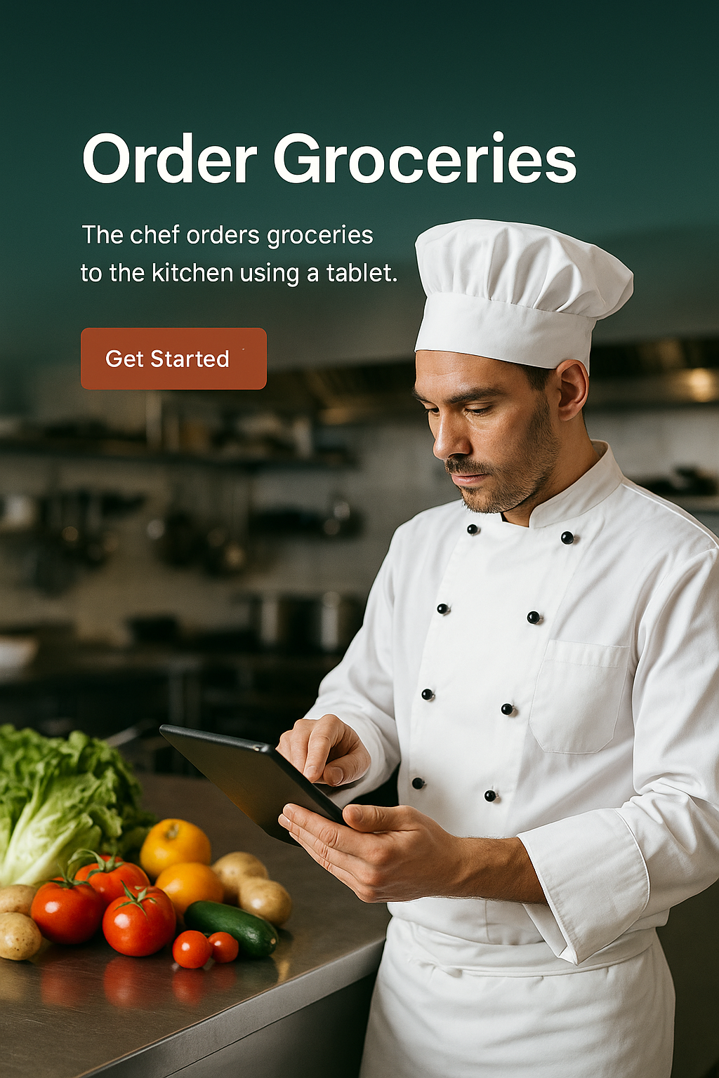 /Collection: /by davooda/Type: PNG/A professional chef in a white uniform uses a tablet to order groceries for the kitchen. Fresh vegetables and greens are displayed on the counter, highlighting a vibrant culinary environment.