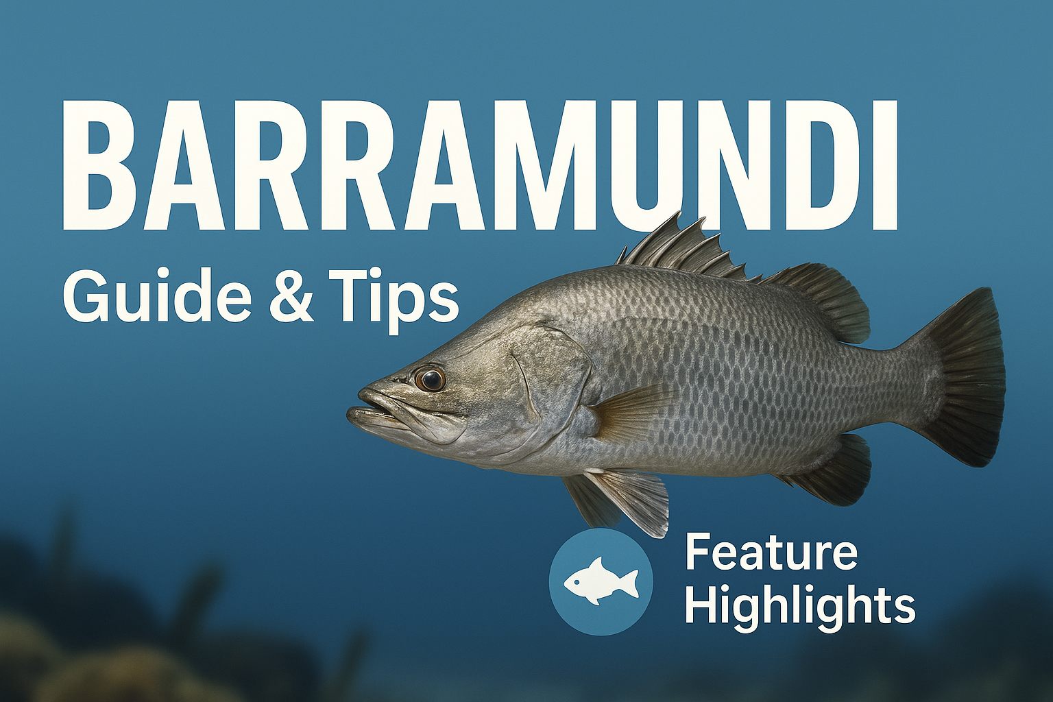 /Collection: /by davooda/Type: PNG/A visually engaging cover for a fishing guide featuring a Barramundi fish. The design uses a clean layout with a focus on informative tips, ideal for fishing enthusiasts and educational content.