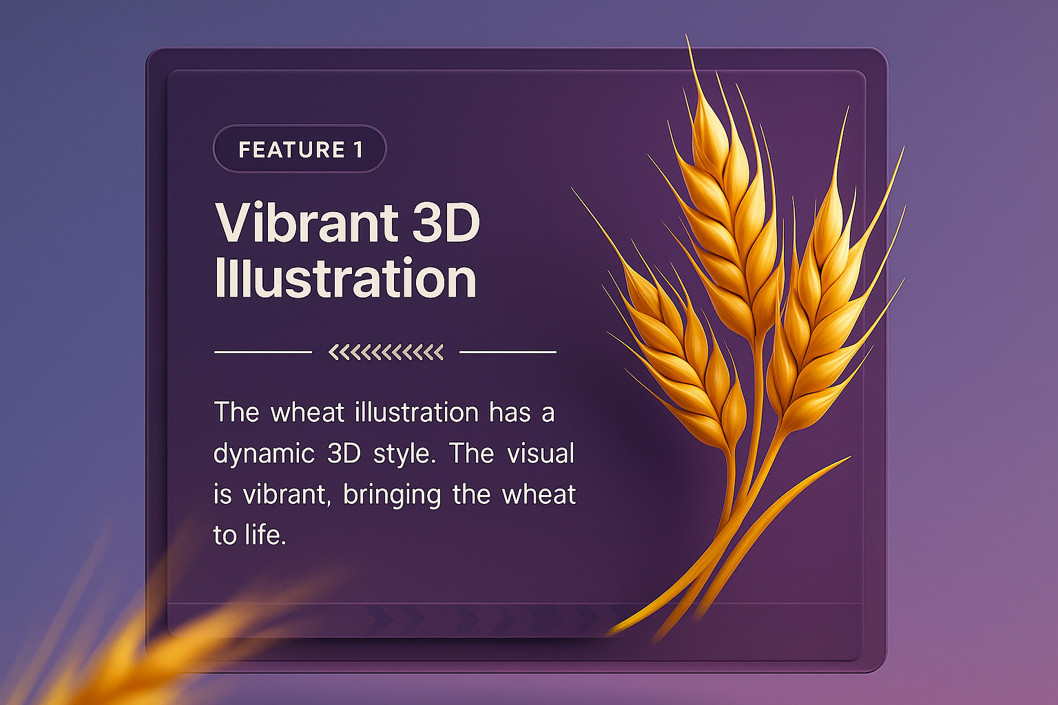 /Collection: /by davooda/Type: PNG/A dynamic 3D illustration of golden wheat ears integrated into a visually appealing block with a gradient background. The design features a modern layout with text and graphics.