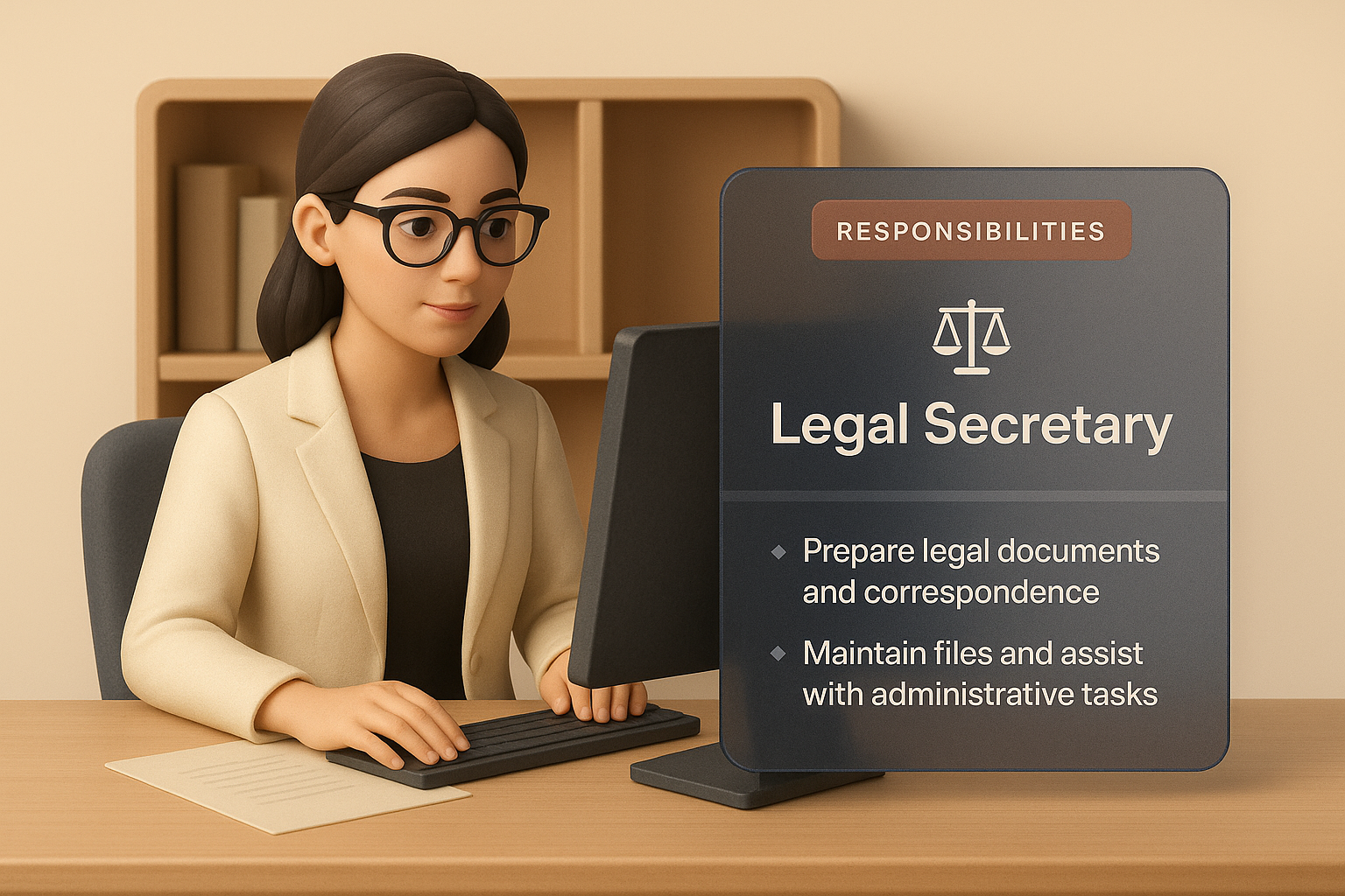 /Collection: /by davooda/Type: PNG/A bright and professional 3D illustration of a legal secretary at a desk, working on a computer. The design features a stylish information block with responsibilities outlined, integrated seamlessly into the scene.