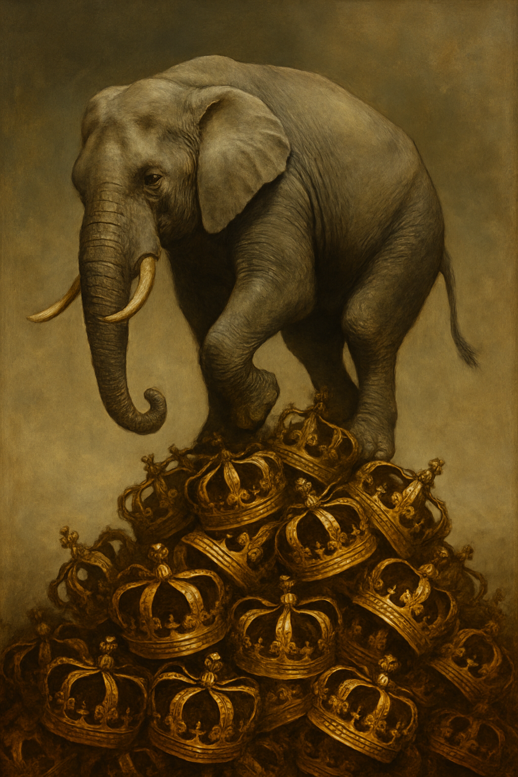 Surreal Artwork of Elephant on Pile of Golden Crowns