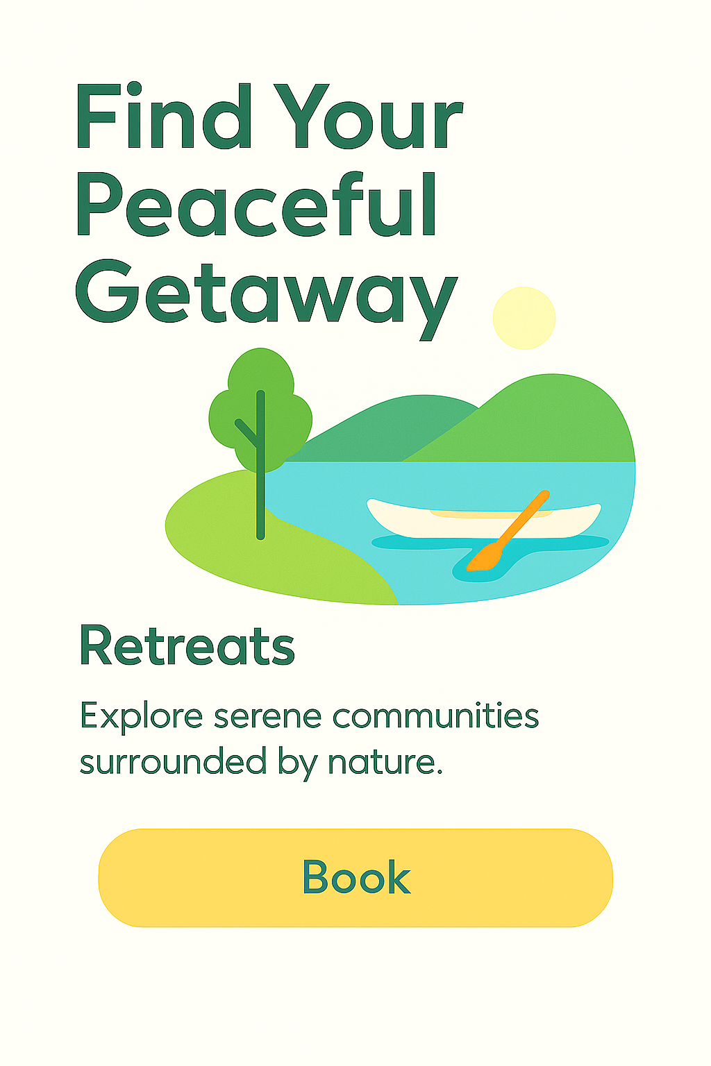 /Collection: /by davooda/Type: PNG/Charming promotional graphic highlighting serene getaways in nature, featuring vibrant illustrations of landscapes, perfect for travel marketing and retreat bookings.