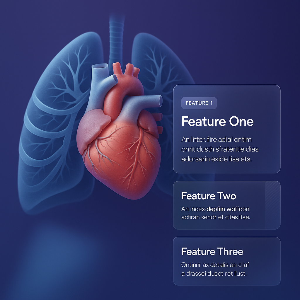 /Collection: /by davooda/Type: PNG/A detailed 3D depiction of a human heart with accompanying lungs, showcasing vessels and bronchial structures. Features labeled sections on a smooth gradient background.