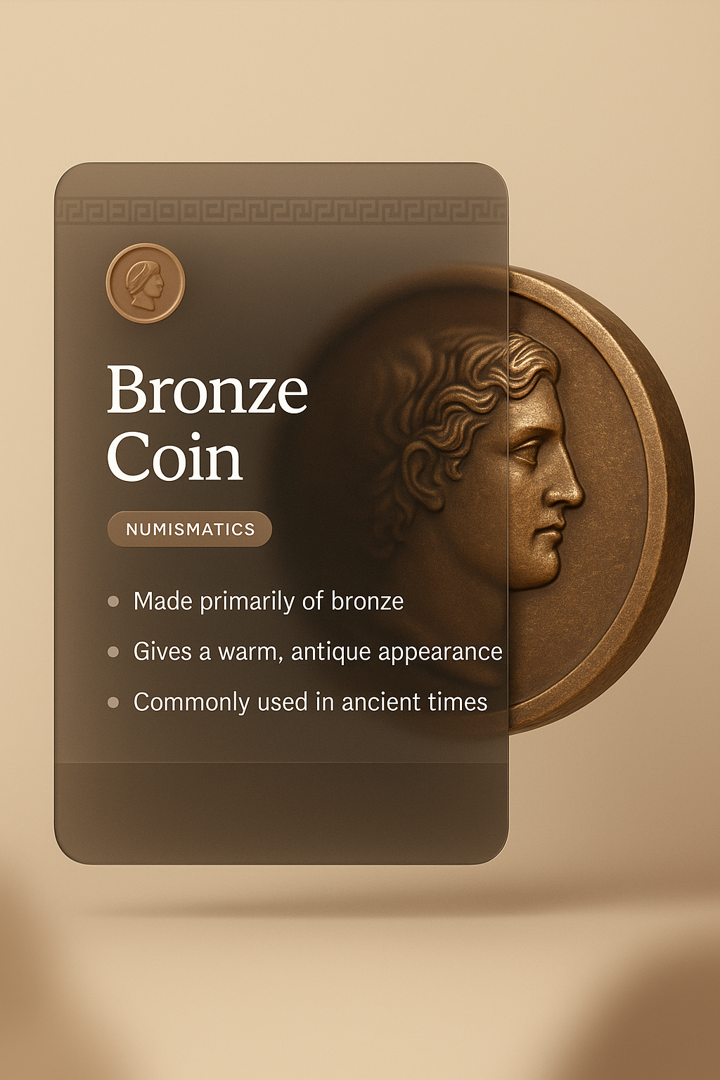 A beautifully designed bronze coin against a soft gradient background, featuring a card with numismatic details. The card includes a title, icon, and key points.