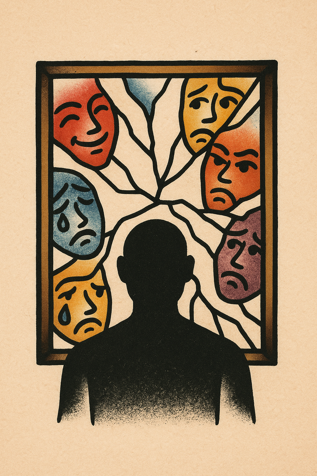 /Collection: /by davooda/Type: PNG/A silhouette stands before a shattered mirror, with colorful fragments displaying various emotions. The tattoo sketch is set against a soft beige background, highlighting the contrast.