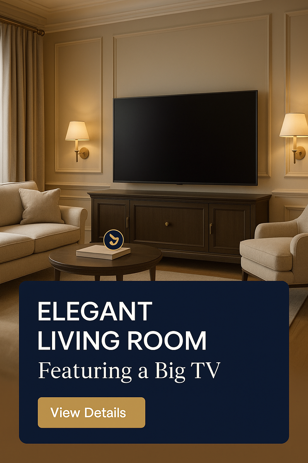 Interior design image showcasing an elegant living room featuring a large TV, modern furnishings, and warm lighting, ideal for home decor inspiration.