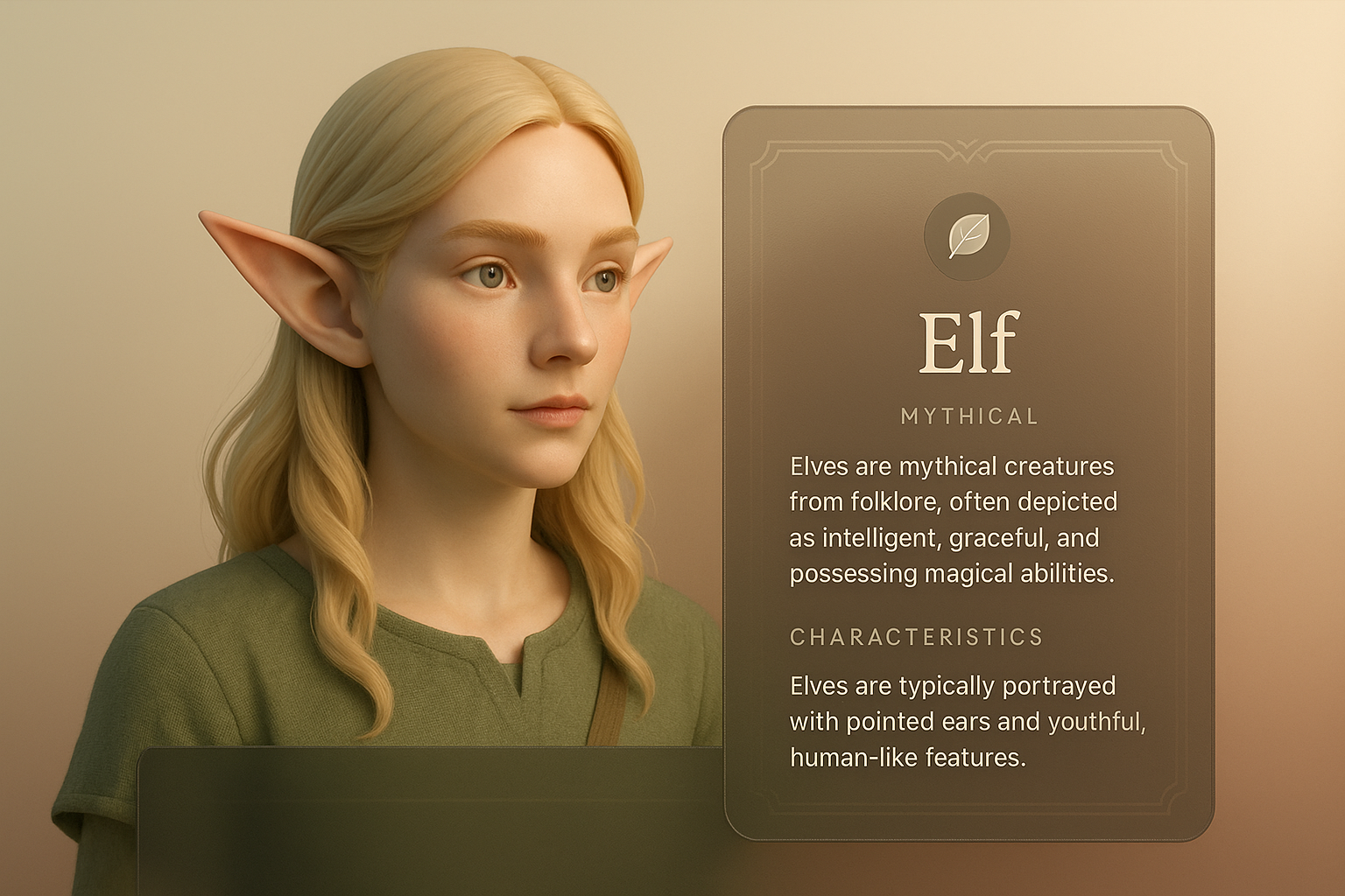 A detailed 3D illustration of an elf with pointed ears and youthful features. The design includes an integrated information block with a smooth gradient background, enhancing readability.