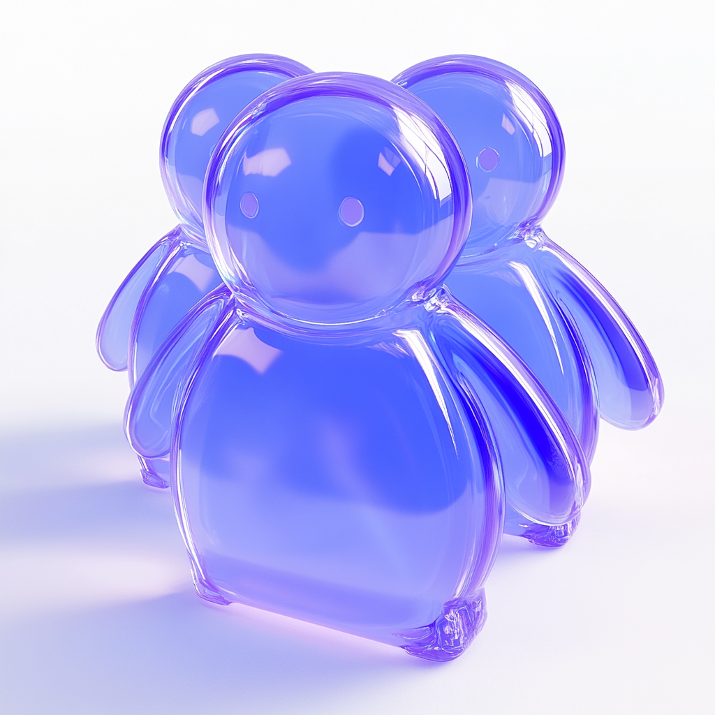 A 3D render featuring three glossy, transparent purple figurines with rounded features, ideal for showcasing playful or whimsical design concepts.
