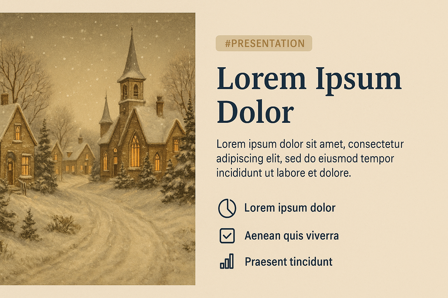 /Collection: /by davooda/Type: PNG/A presentation slide featuring a serene winter landscape with quaint houses and snowfall, designed for professional use. The warm color palette and elegant typography enhance its visual appeal.