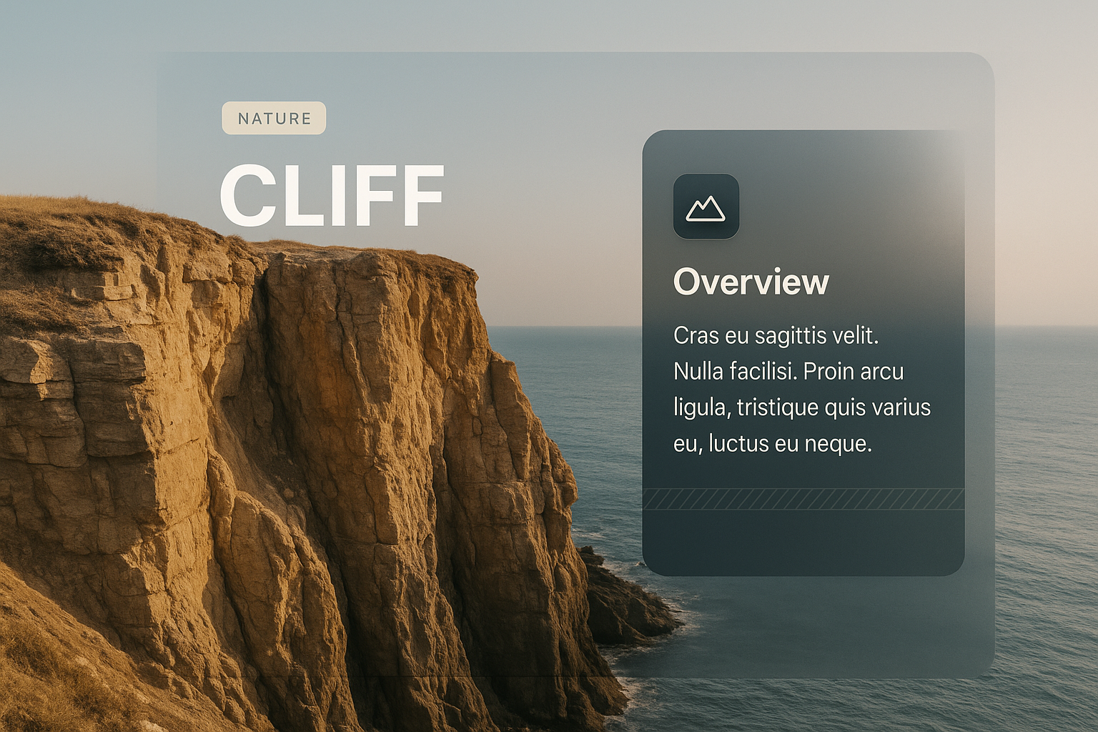 This image showcases a web page design concept featuring a cliff backdrop. The layout includes two integrated blocks with a title, icon, and descriptive text, all on a smooth gradient background.