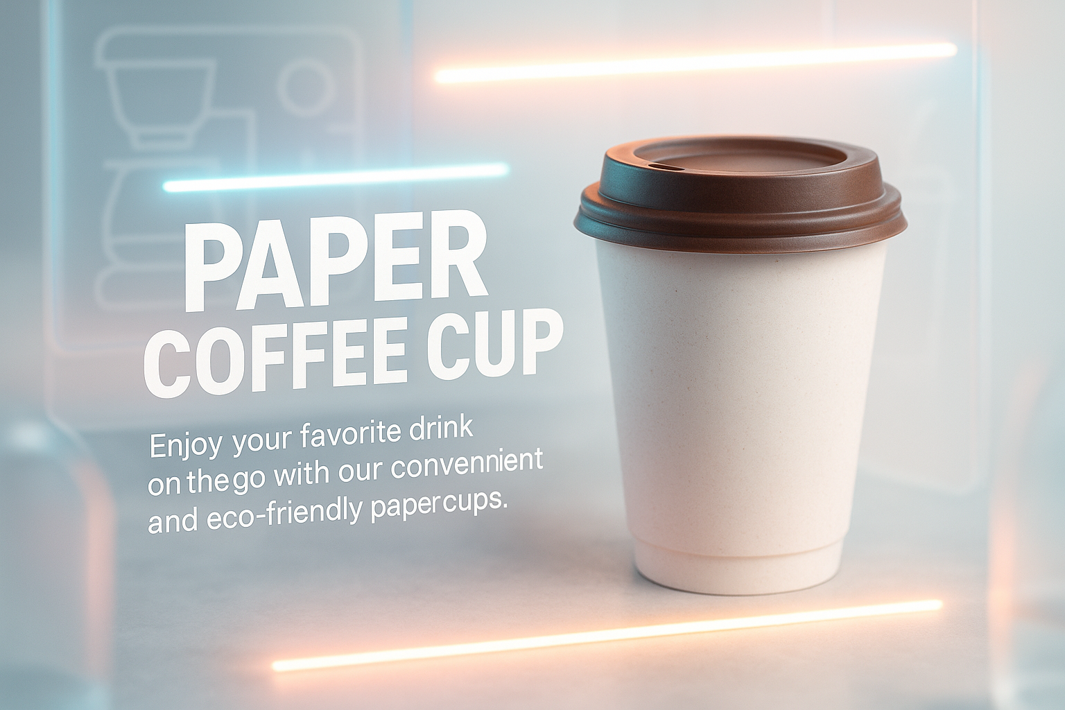 Promotional graphic showcasing an eco-friendly paper coffee cup with modern design elements, ideal for coffee shops and environmentally conscious brands.
