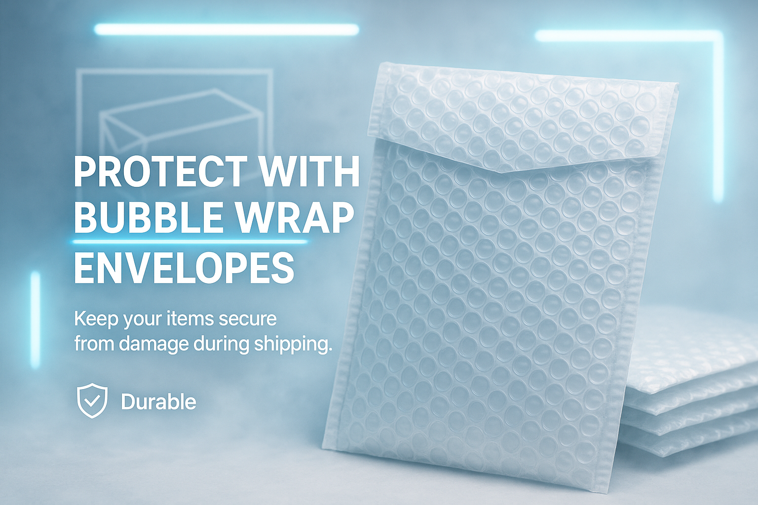 Modern promotional graphic showcasing bubble wrap envelopes with a focus on durability and protection during shipping. Ideal for e-commerce and packaging businesses.