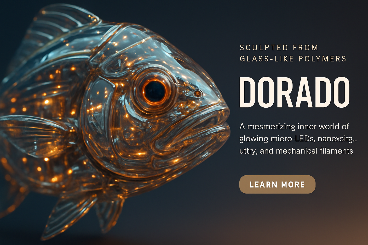 /Collection: /by davooda/Type: PNG/This image showcases a hyperrealistic Dorado fish, intricately designed with glass-like polymers. Its glowing inner components, including micro-LEDs and fine filaments, create a stunning visual effect.