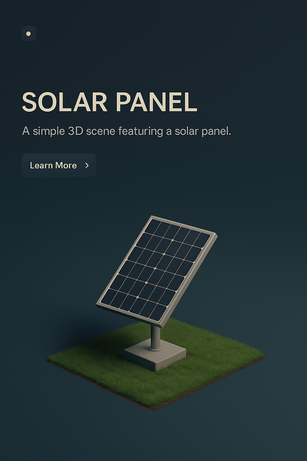 A visually appealing 3D scene featuring a solar panel on green grass against a dark gradient background. The design includes a simple layout with text elements.
