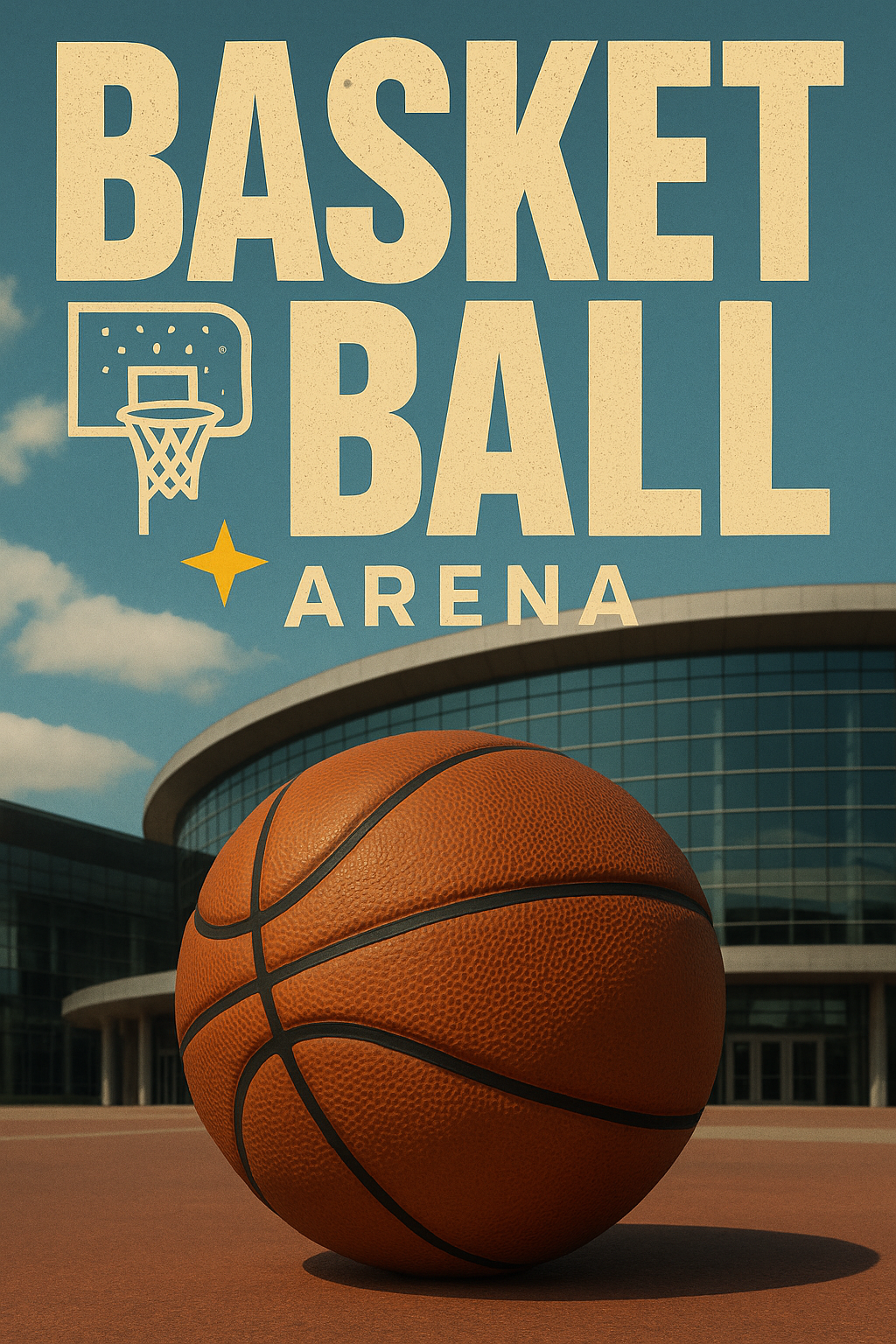Vibrant promotional image featuring a basketball in front of a modern arena, ideal for sports marketing and event promotions.