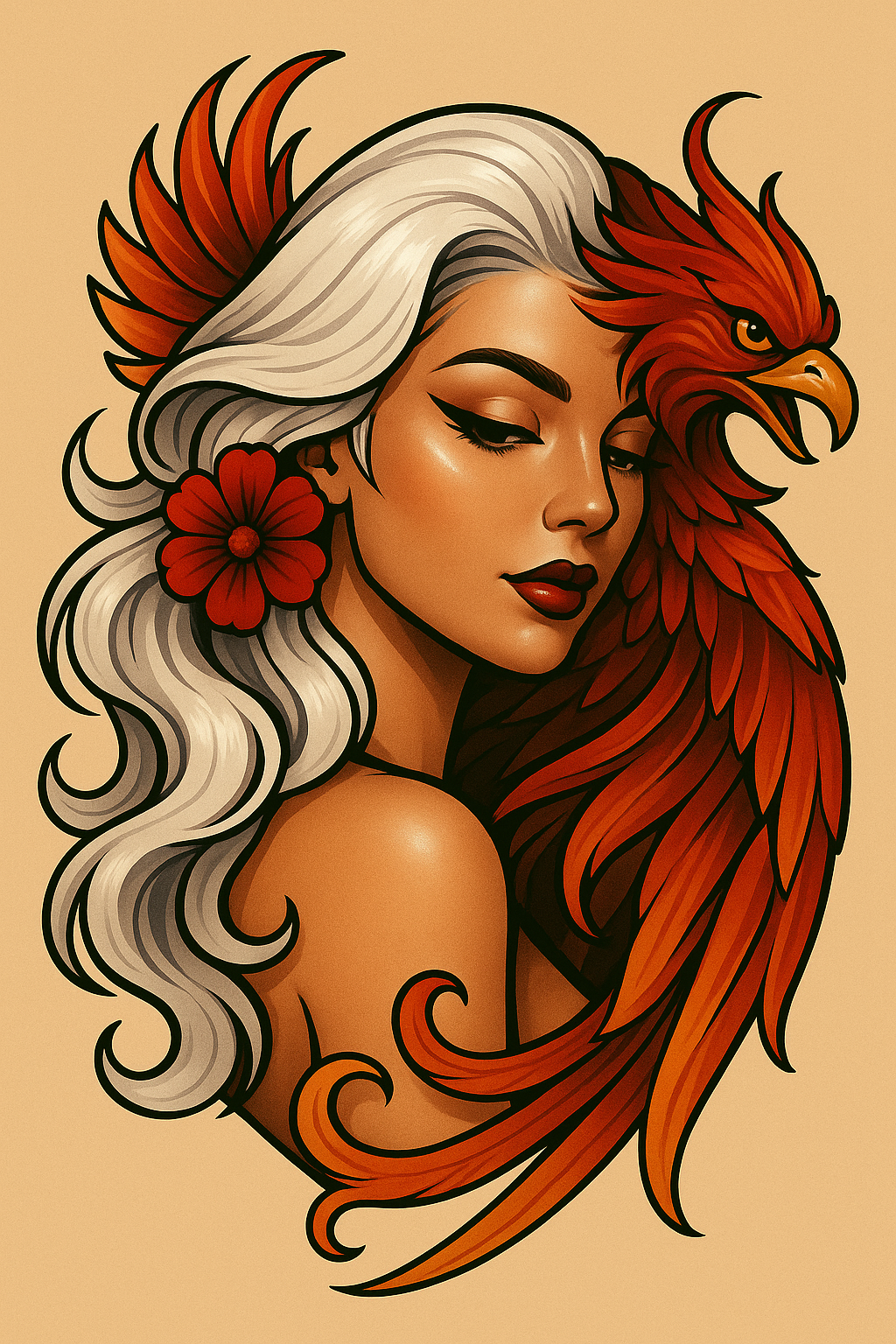 Girl with Phoenix: A Glossy Tattoo Style Illustration