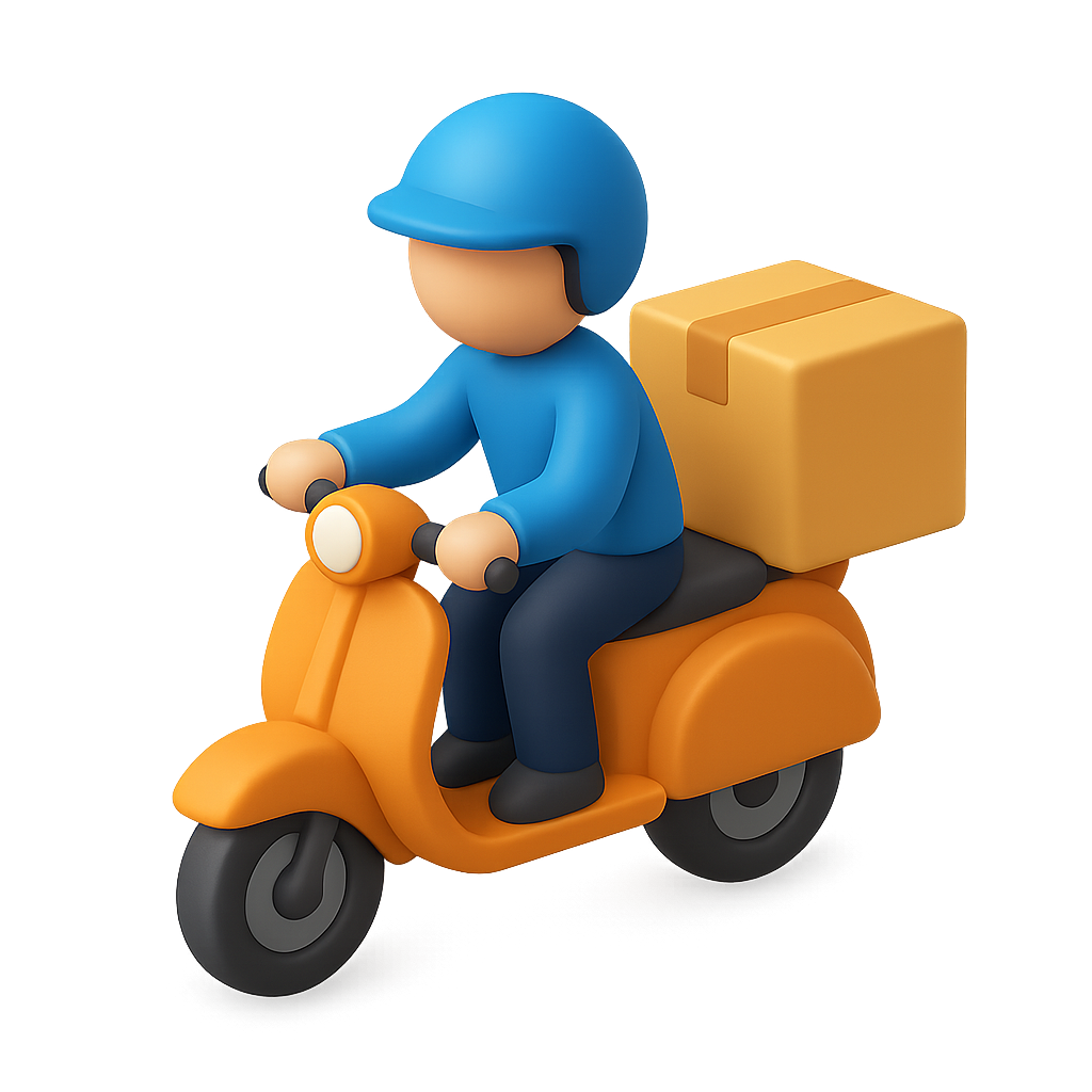 A vibrant 3D delivery icon featuring a rider on a scooter carrying a package. The design showcases a three-quarter view, enhancing the isometric and volumetric feel.