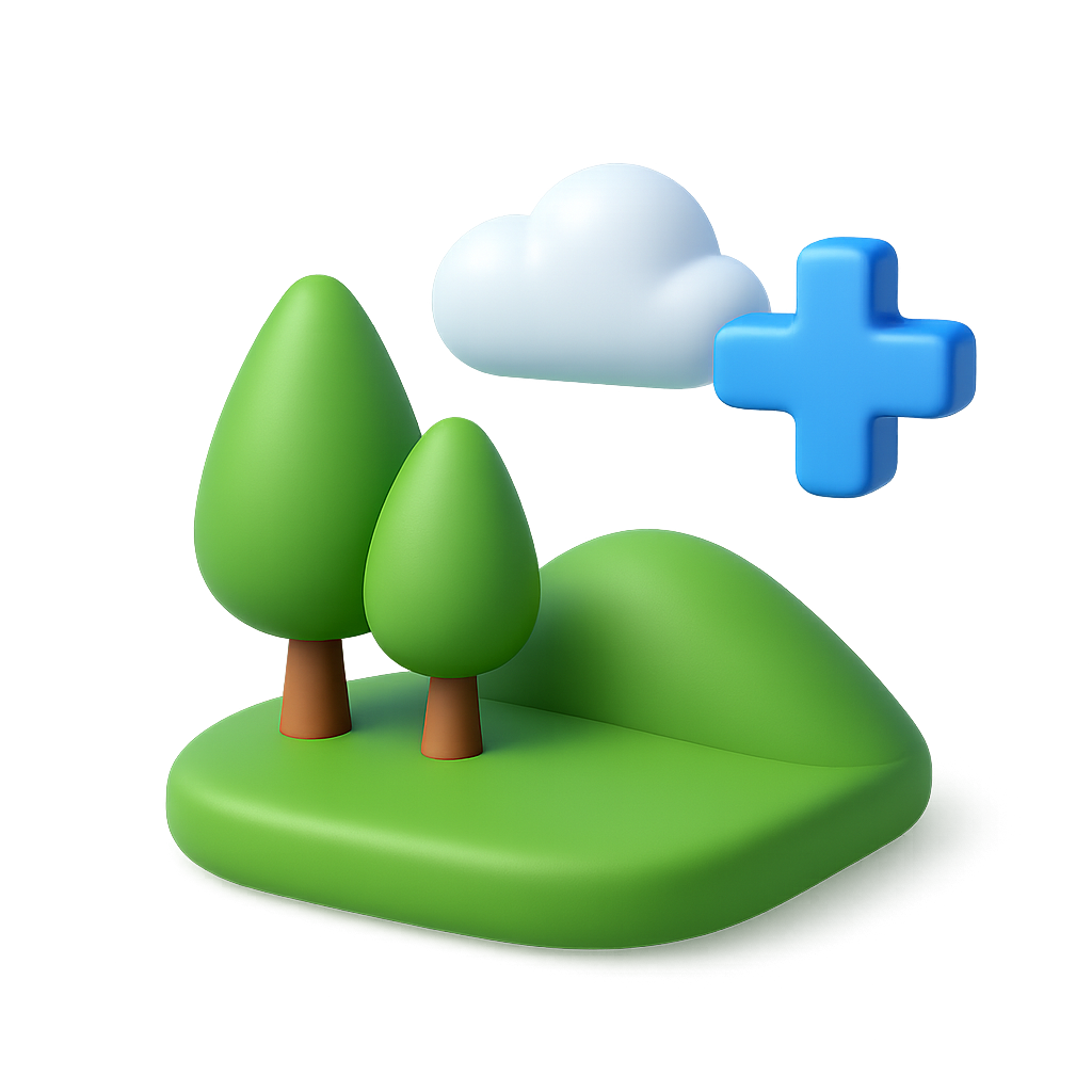 A vibrant isometric nature scene featuring stylized green hills, two trees, and a fluffy cloud, all rendered in a 3D effect with a transparent background.