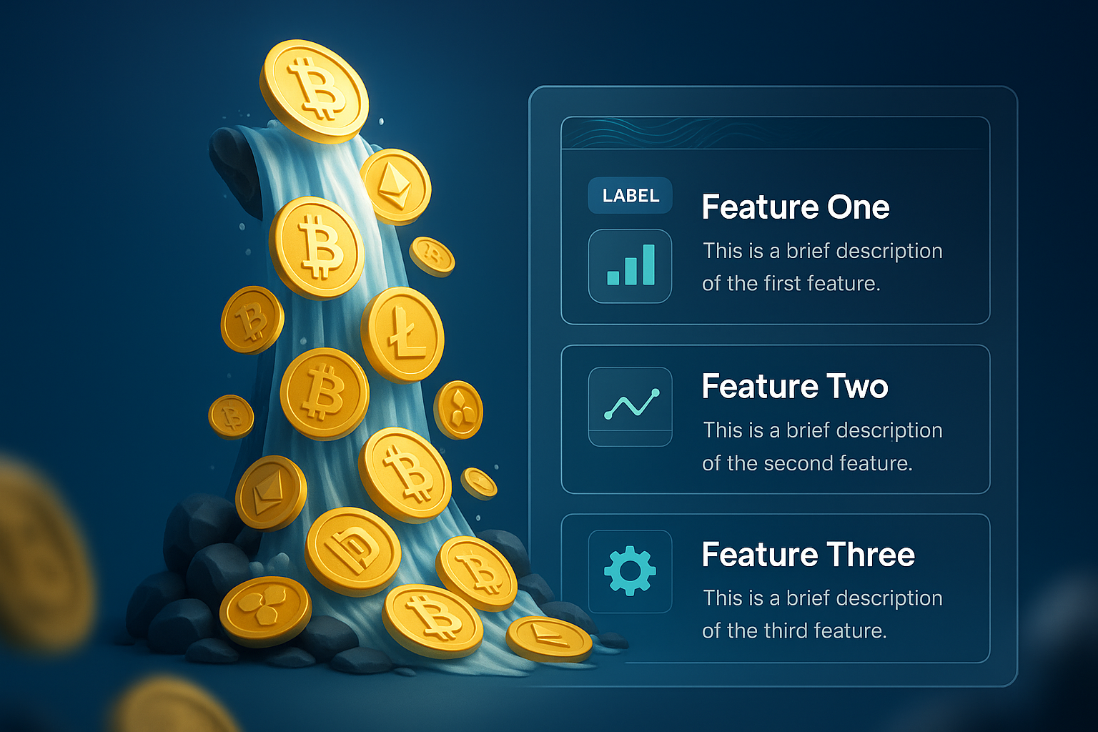 /Collection: /by davooda/Type: PNG/A vibrant 3D illustration depicting a waterfall of golden crypto coins, featuring three informative blocks with descriptions and a label. The design integrates smoothly with a gradient background.