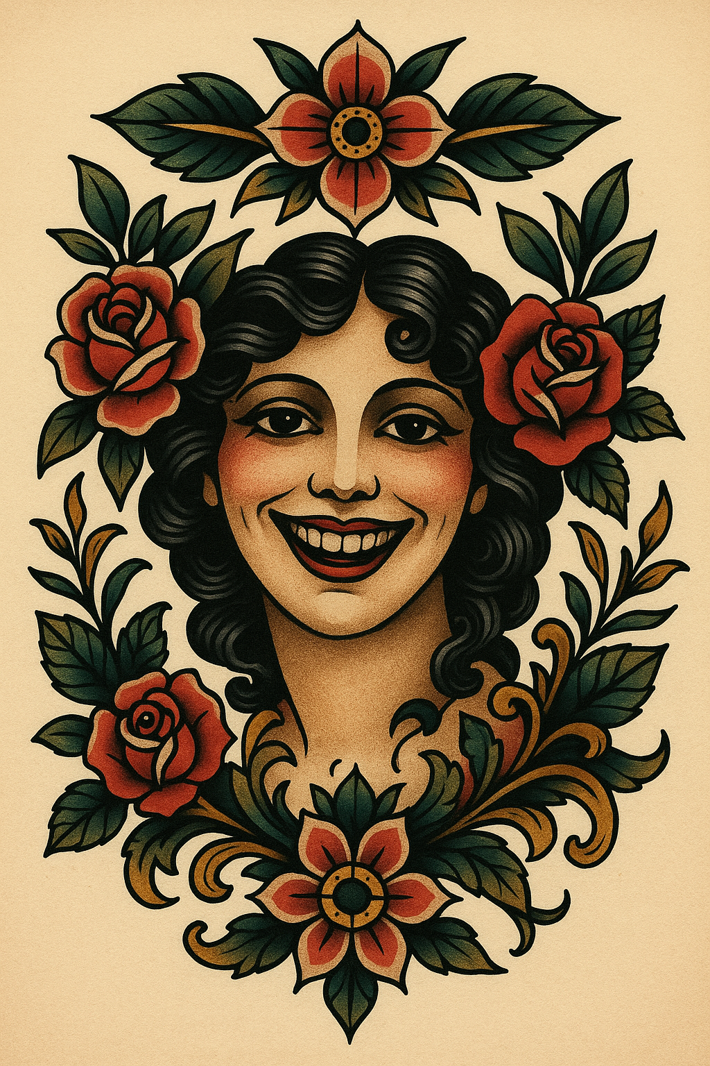 Classic Tattoo Art of a Woman Surrounded by Roses
