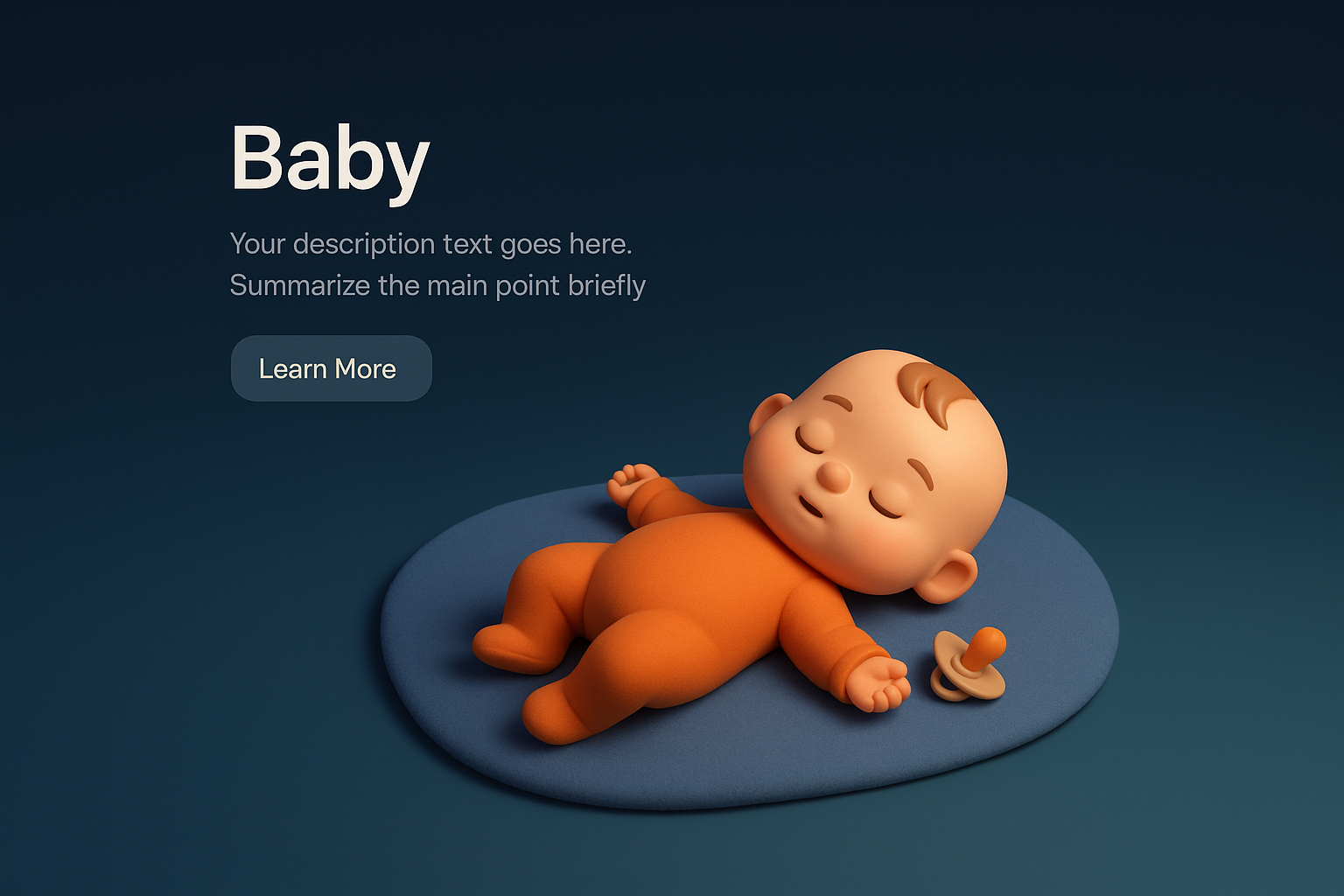 /Collection: /by davooda/Type: PNG/This image showcases a stylized 3D baby peacefully sleeping on a soft surface, set against a dark gradient background. The design includes a concise title and a 'Learn More' button, creating a visually appealing layout.
