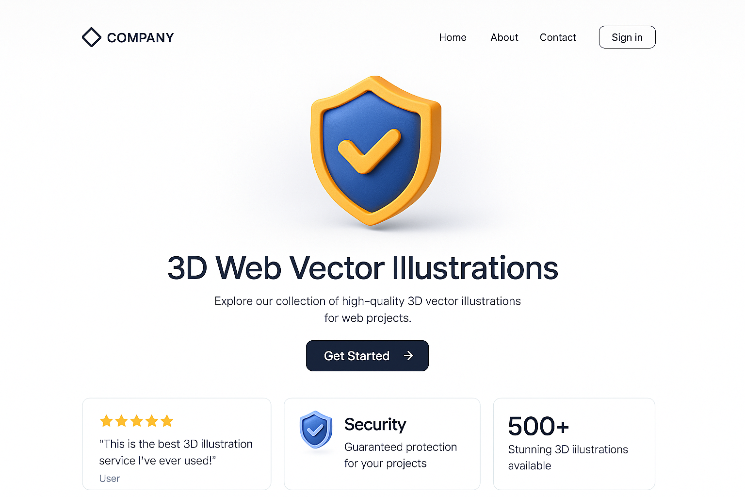 A sleek landing page design featuring a 3D shield icon, showcasing web vector illustrations with a user-friendly layout and engaging call-to-action elements.