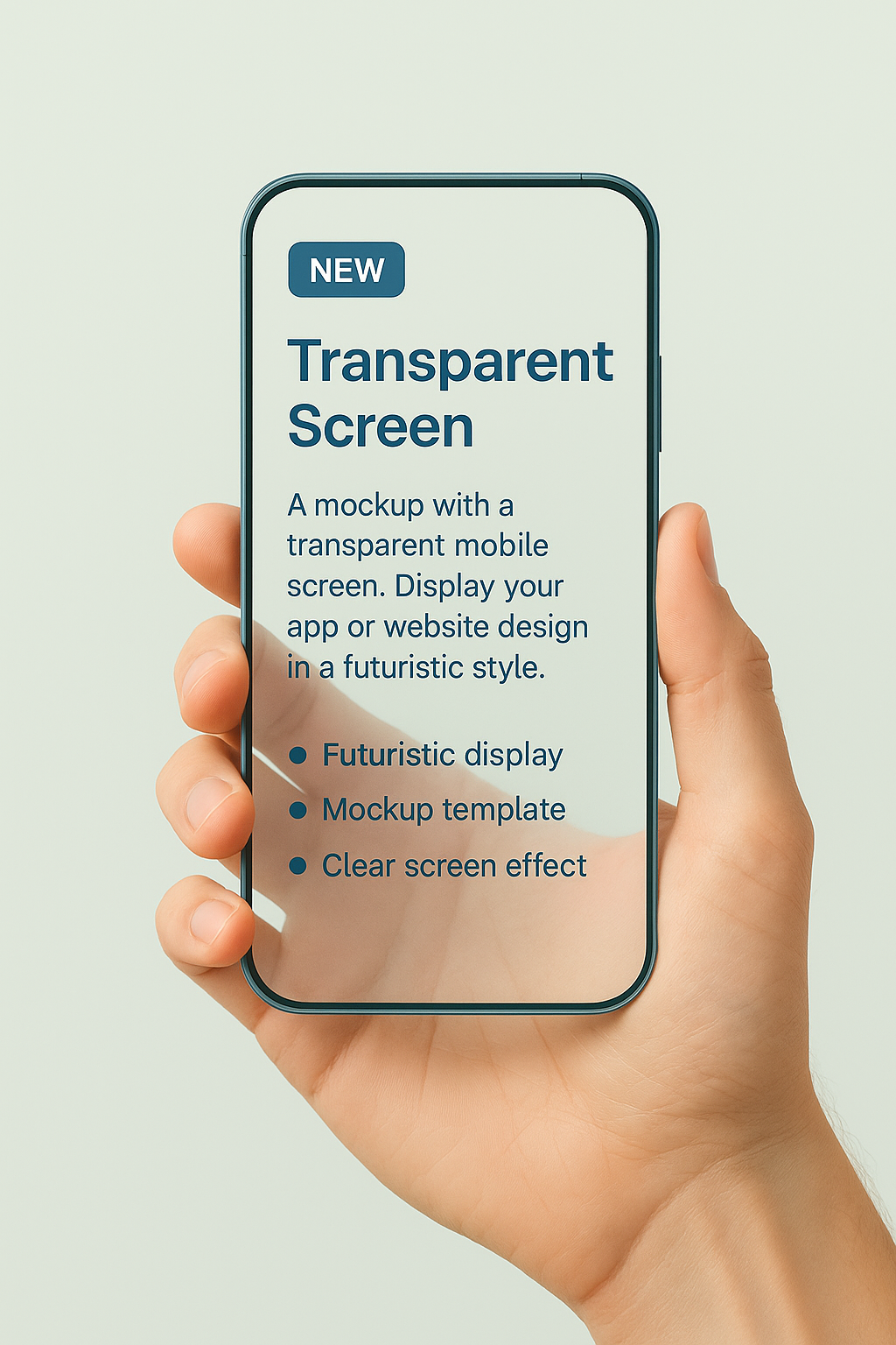 A sleek and modern mockup featuring a transparent mobile screen held in hand, ideal for showcasing app or website designs in a futuristic style.