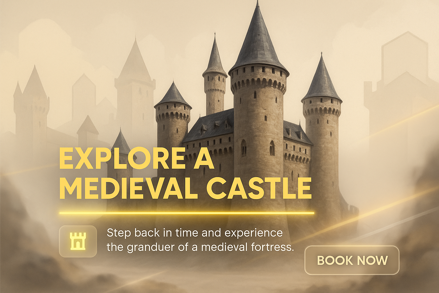 /Collection: /by davooda/Type: PNG/A visually appealing promotional banner showcasing a medieval castle, inviting viewers to explore its grandeur. Ideal for travel or historical experiences.