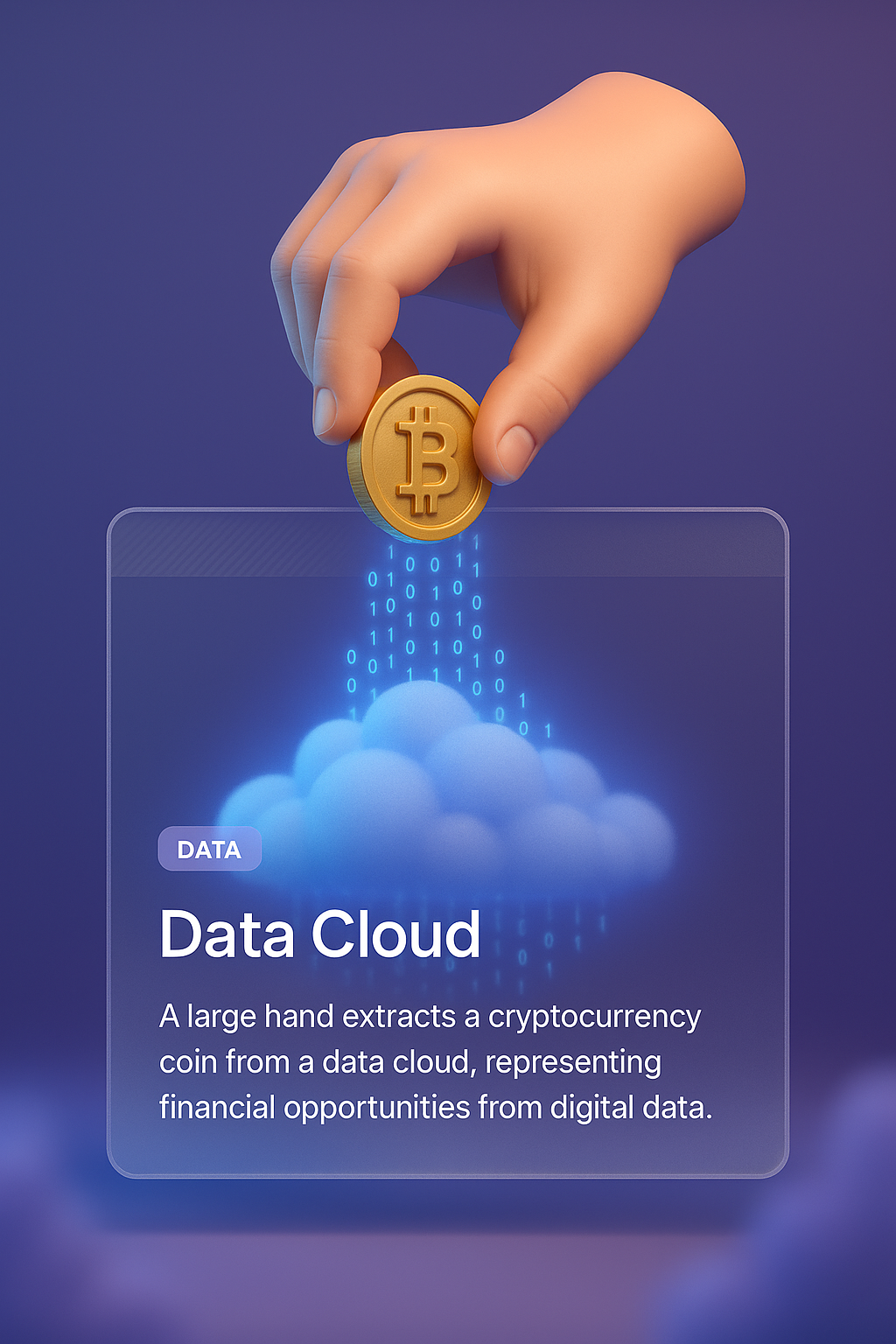/Collection: /by davooda/Type: PNG/A large hand is depicted pulling a cryptocurrency coin from a data cloud, symbolizing financial opportunities. The background features a smooth gradient, enhancing the 3D effect.