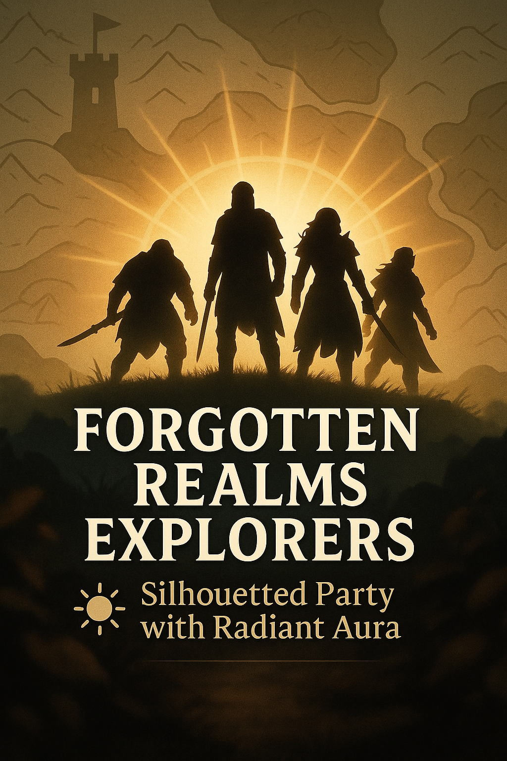 /Collection: /by davooda/Type: PNG/A captivating fantasy-themed graphic depicting a group of silhouetted adventurers set against a radiant background. Ideal for promoting tabletop games or adventure stories.