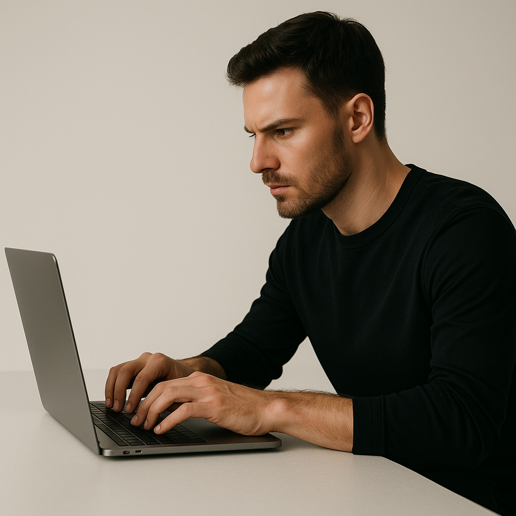 A man concentrates as he types quickly on a laptop, showcasing a minimalist aesthetic. His focused expression suggests dedication and efficiency in his work.