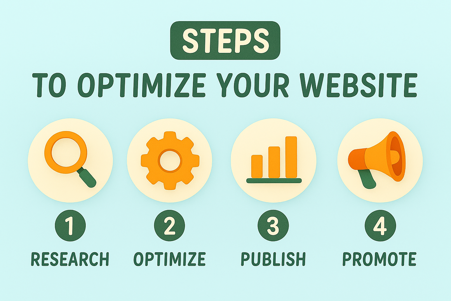 Colorful infographic illustrating four essential steps to optimize a website, featuring icons and a clean, modern design suitable for digital marketing tutorials.