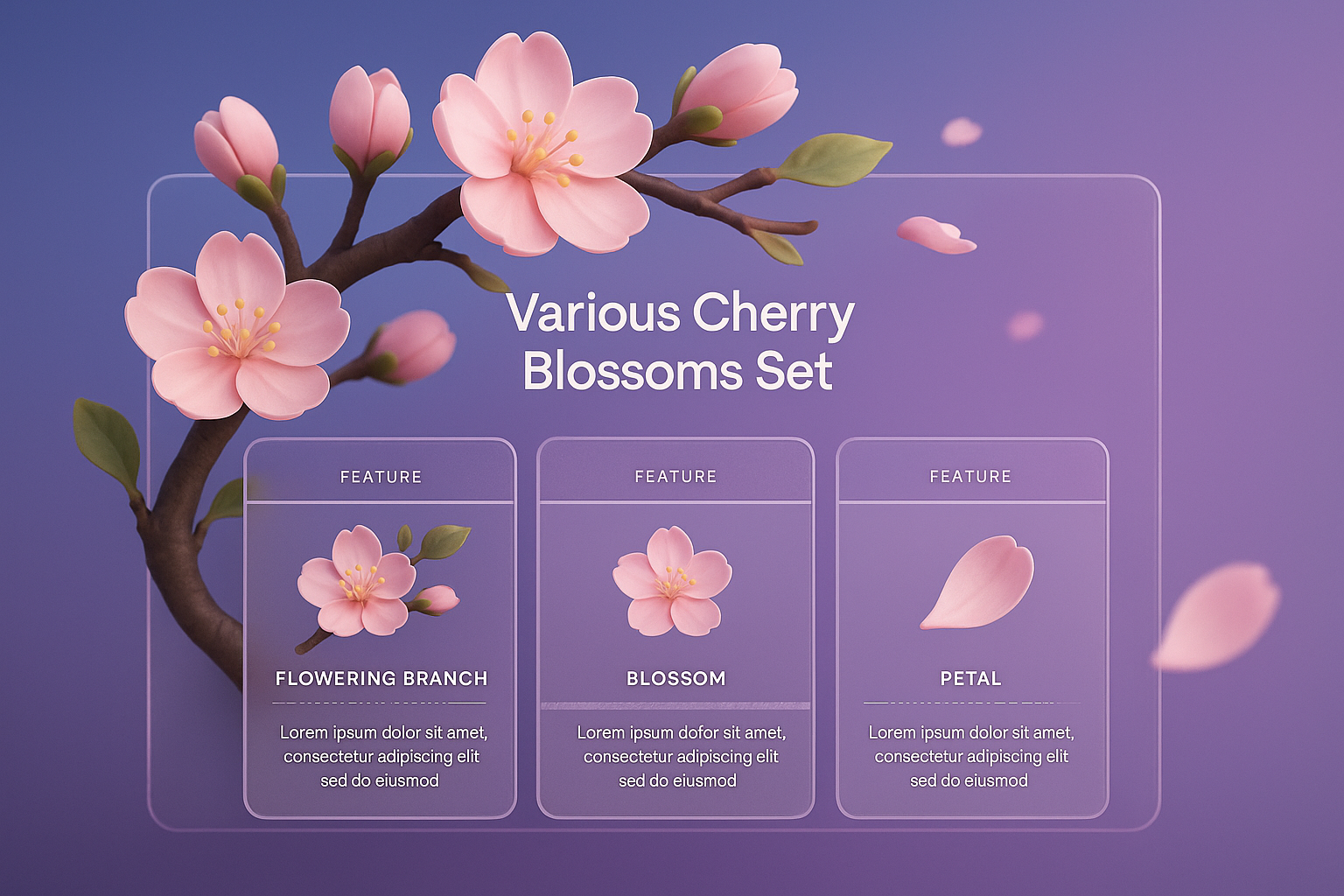 /Collection: /by davooda/Type: PNG/A vibrant 3D representation of cherry blossoms featuring a flowering branch. The image includes blocks highlighting features like blossoms and petals, set against a smooth gradient background.