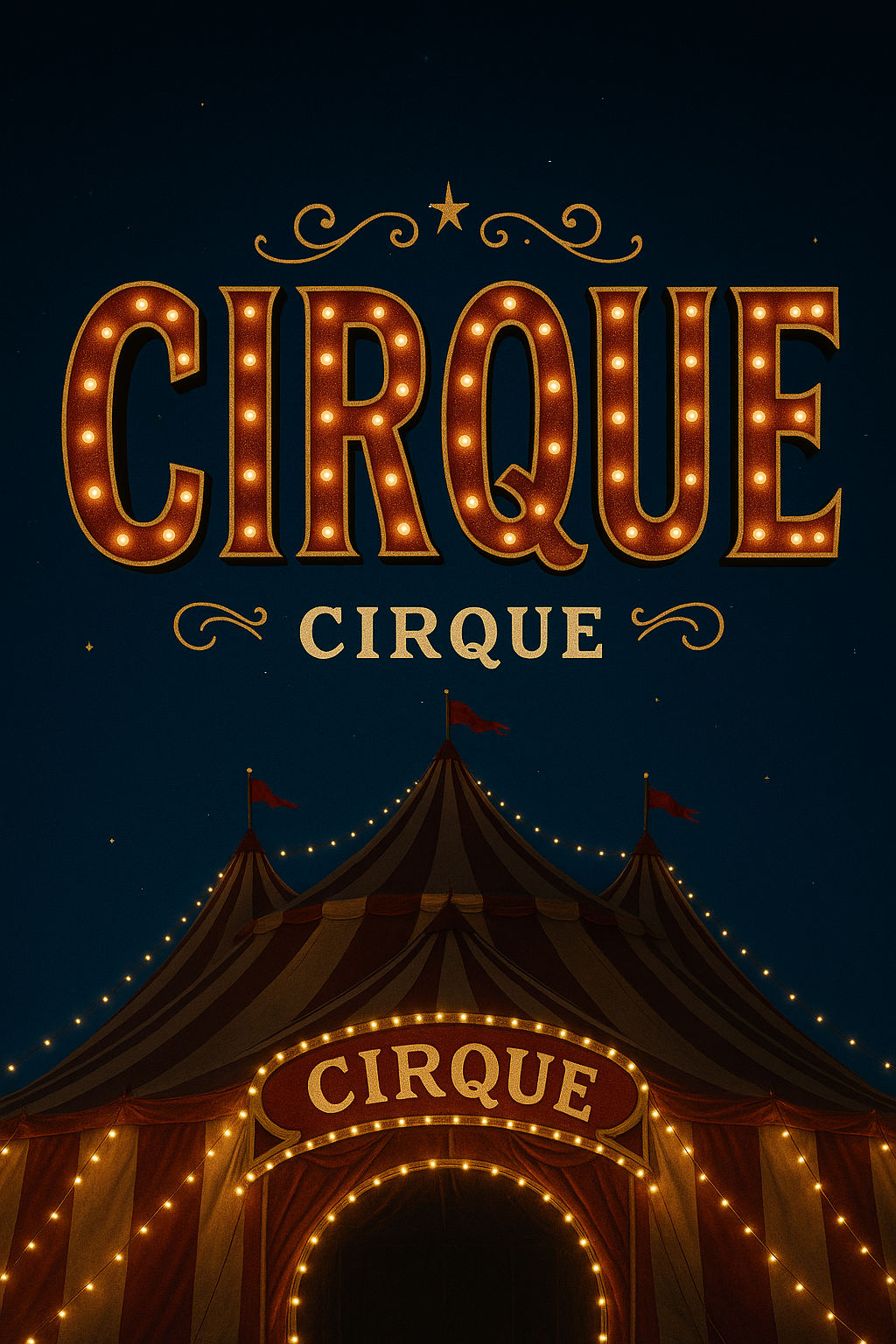 /Collection: /by davooda/Type: PNG/A captivating graphic featuring a vintage circus theme with bold, illuminated typography and a classic circus tent backdrop, ideal for event promotions or entertainment advertising.